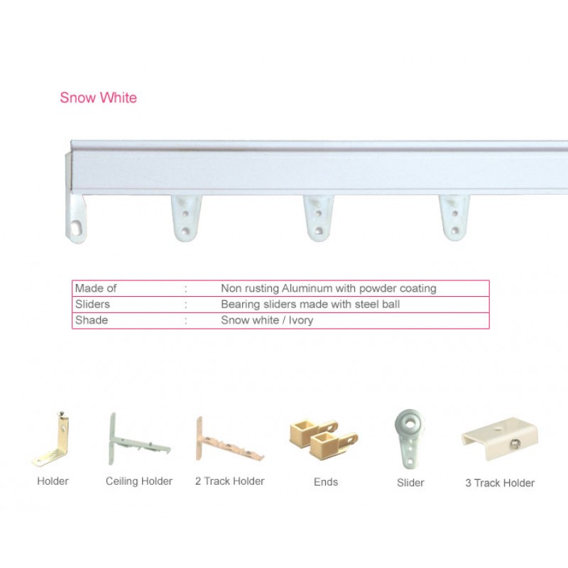 The Channel used in this series is non rusting Aluminium with powder coating. The heart of this series is its bearing sliders which are made with steel balls to give a feather-touch movement to the curtains. There are two colours in Power Track. They are Ivory and Snow White.